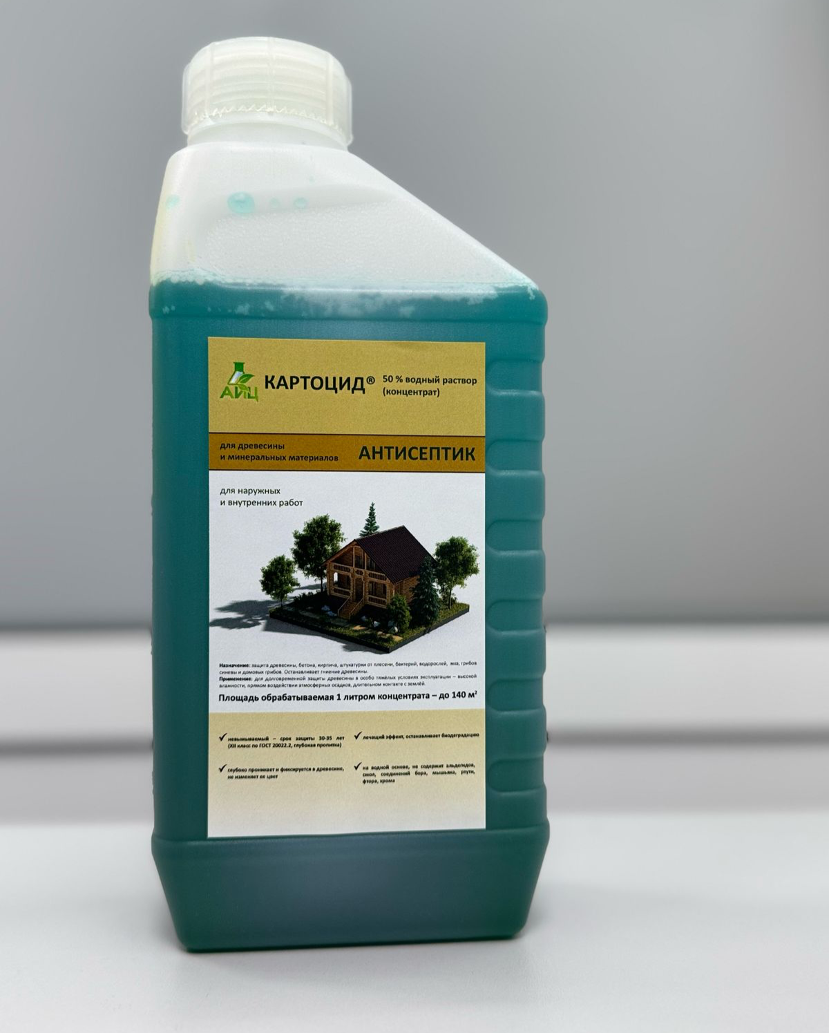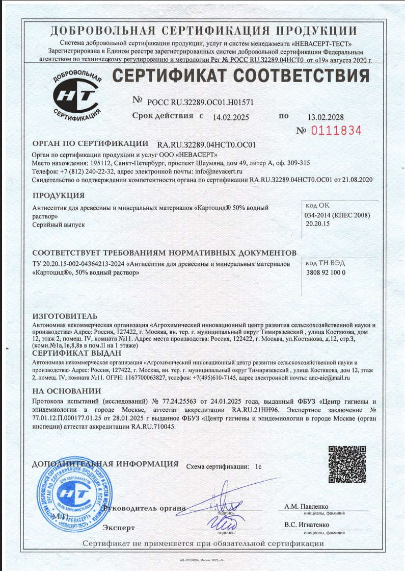 Препарат «Картоцид» обладает уникальными биологическими свойствами. Он является, одновременно, фунгицидным препаратом для растений и антисептиком для неметаллических материалов (древесины, камня, бетона, гипса, штукатурки, лаков, красок, эмалей). Такая универсальность обусловлена комплексным действием на причины болезней и биоповреждений. Биоповреждения различных материалов вызваны, в первую очередь, действием грибов, бактерий, водорослей и насекомых. Ведущее место в появлении биоповреждений занимают грибы.