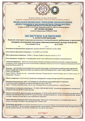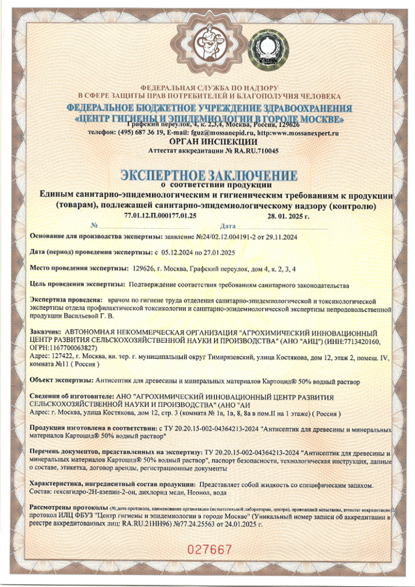 № 77.01.П.000177.01.25 от 28.01.2025 г. выданное ФБУЗ «Центр гигиены и эпидемиологии в городе Москве (орган инспекции) аттестат аккредитации RA.RU/710045.