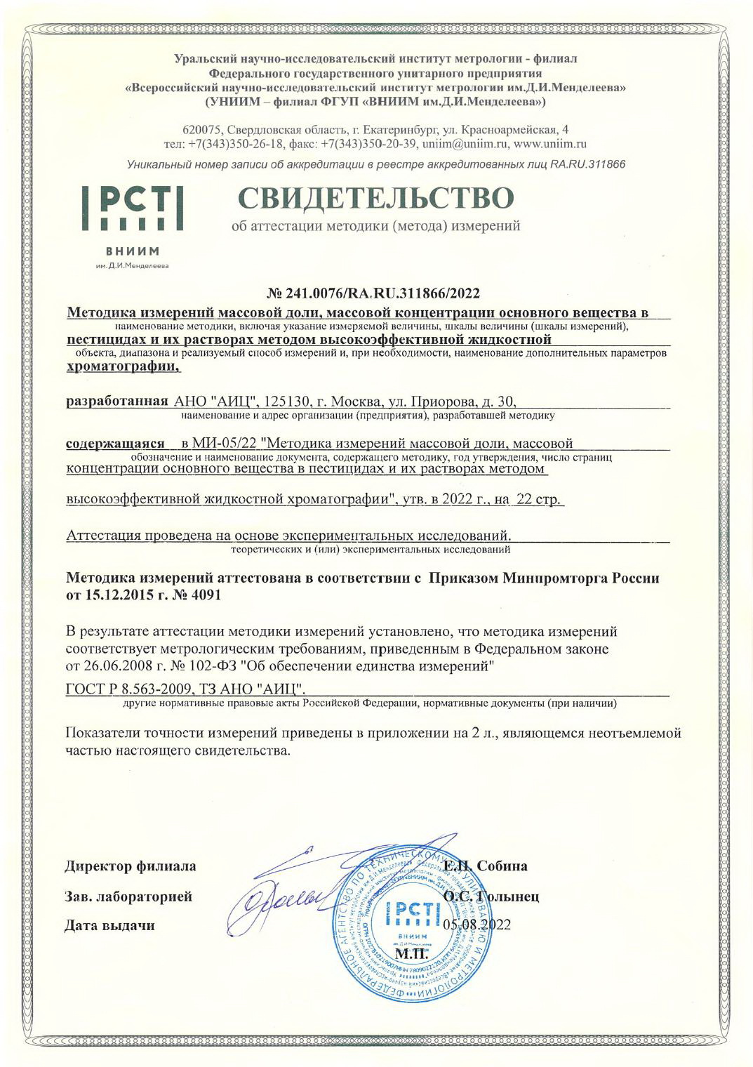 АНО "АИЦ" 05.08.2022 прошёл аттестацию МИ-05/22 «Методика измерений массовой доли, массовой концентрации основного вещества в пестицидах и их растворах методом высокоэффективной жидкостной хроматографии» в соответствии с Приказом Минпромторга России от 15.12.2015 г. № 4091.